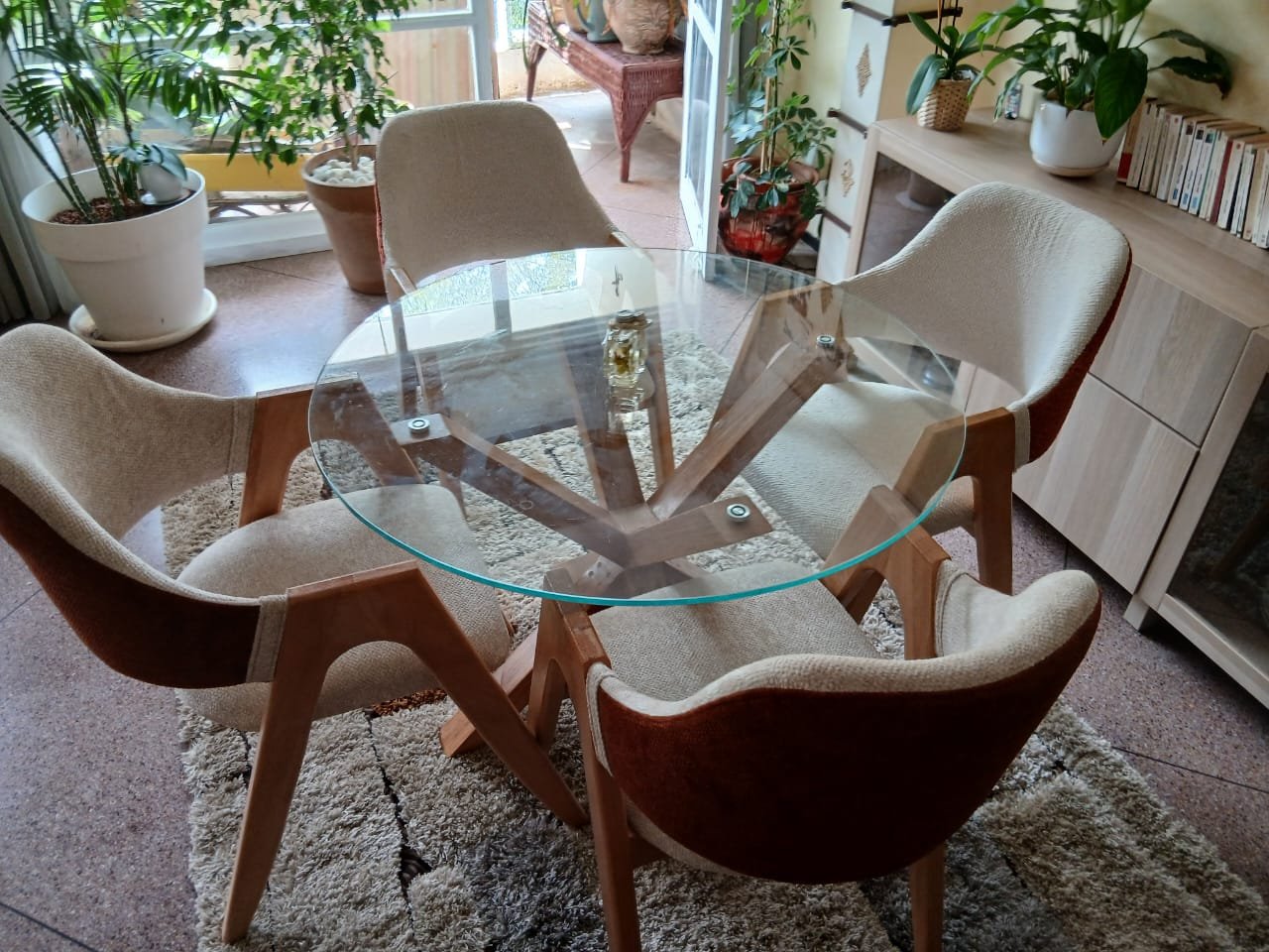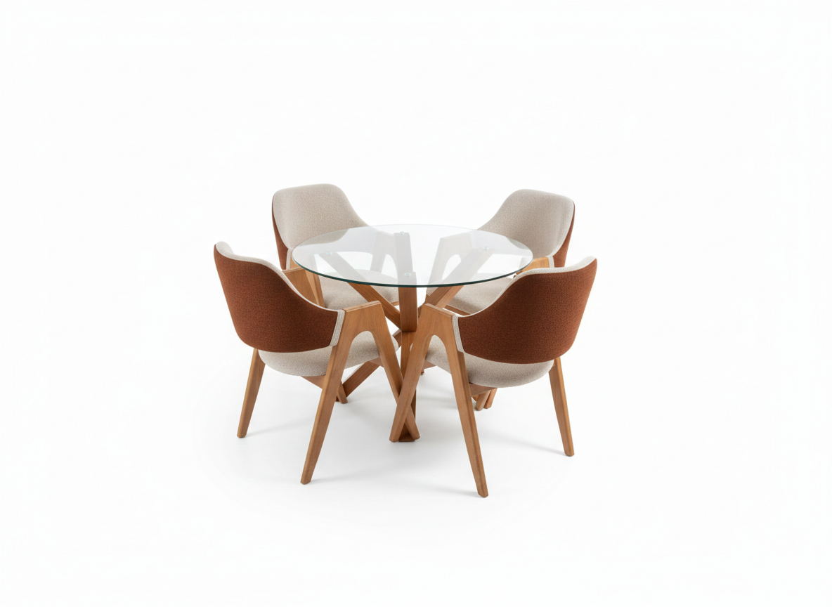 La table se distingue par son plateau circulaire en verre trempé transparent, qui met en valeur un piétement sculptural en bois massif aux lignes croisées. Elle est accompagnée de quatre chaises au design ergonomique, dotées d’un revêtement en tissu bicolore : un beige crème lumineux à l’intérieur et un brun terreux texturé à l’extérieur pour un contraste visuel saisissant.